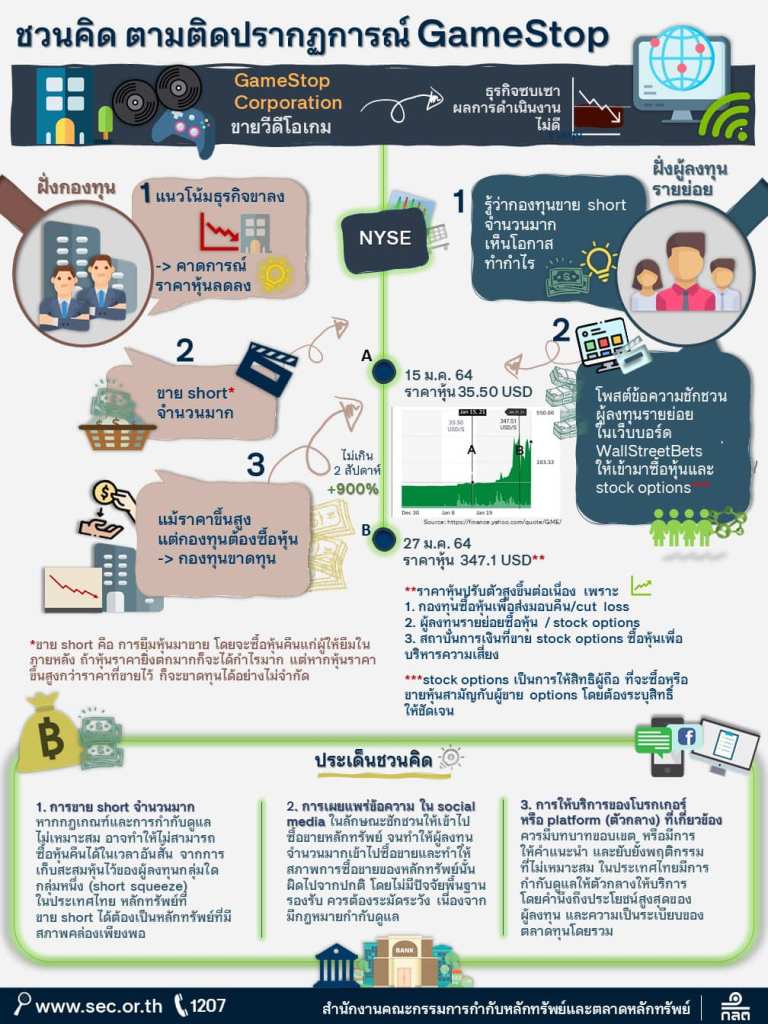 กรณีนี้ ปรากฎข่าวตามสื่อออนไลน์ต่าง ๆ ว่า ก.ล.ต. สหรัฐอเมริกา อยู่ระหว่างติดตามตรวจสอบพฤติกรรมการซื้อขายหุ้นที่มีความผันผวน อันนำไปสู่การปรับตัวที่สูงขึ้นอย่างมากของราคาหุ้น GameStop และหุ้นตัวอื่น ๆ รวมถึงพิจารณามาตรฐานในการประกอบธุรกิจของตัวกลาง ที่ต้องคำนึงถึงประโยชน์ของผู้ลงทุน มีการให้บริการอย่างเป็นธรรม ไม่ทำให้ผู้ลงทุนเสียประโยชน์ และพิจารณาดำเนินการตามกฎหมาย หากพบการกระทำผิดที่เกี่ยวข้อง ทั้งนี้ เพื่อเป็นการคุ้มครองผู้ลงทุน และเพื่อให้มั่นใจว่า ระบบการซื้อขายในตลาดหลักทรัพย์ เป็นไปอย่างมีประสิทธิภาพ เป็นธรรม และมีความเป็นระเบียบเรียบร้อย ซึ่งเราคงต้องติดตามกันต่อไป ว่าผลสุดท้ายจะเป็นอย่างไร